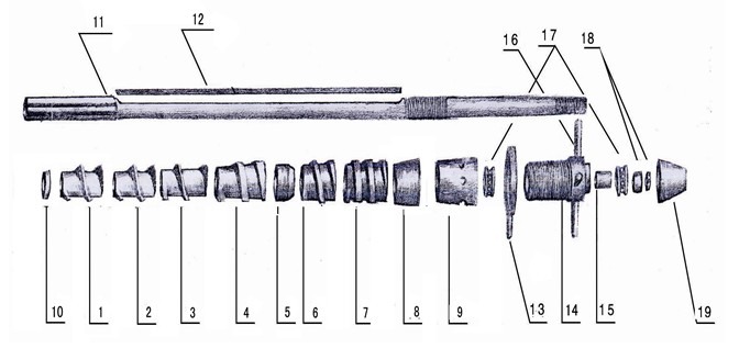 (2)榨螺的安裝:將榨螺立起細端向上,裝上檔圈,在把榨螺由1號起依次裝于軸上,然后用鎖緊螺母壓緊,以防油渣深入榨螺孔內,影響榨螺的拆卸。(調節(jié)螺母使調節(jié)栓兩端是8309軸承,裝時兩軸承大孔面均靠在調節(jié)螺栓的兩端面。榨螺整體裝齊后用兩個(M42×2)的螺帽背緊,背緊時注意兩個8309軸承的縫隙 。用手搬轉調節(jié)螺栓,感到轉動靈活時即可。