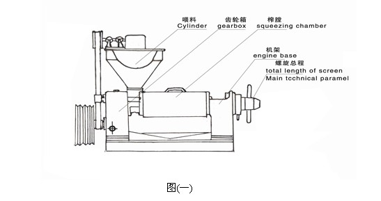 2.結構:該機有進料斗部分,齒輪箱部分,榨膛部分,榨螺部分,機架部分共五大部分組成:見圖(一)